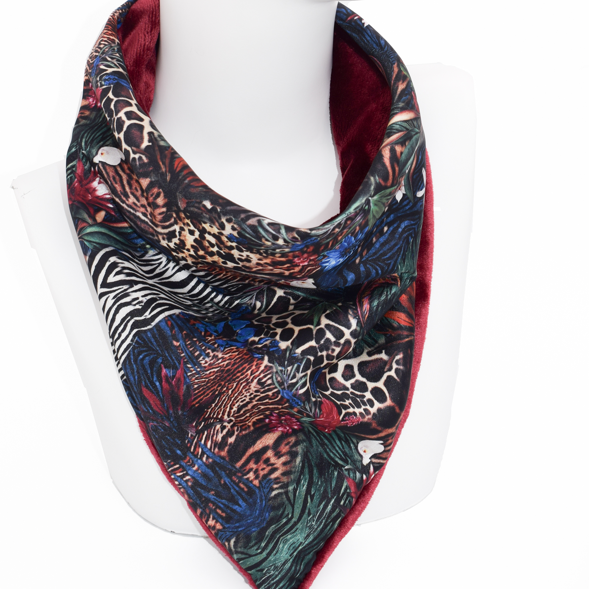 Φόρεσέ το με τη fleece πλευρά μπροστά για άνεση τις κρύες ημέρες ή γύρισε τη σατέν πλευρά με το tropical μοτίβο για πιο statement εμφάνιση. Ταιριάζει υπέροχα με καμηλό ή μπορντώ παλτό.