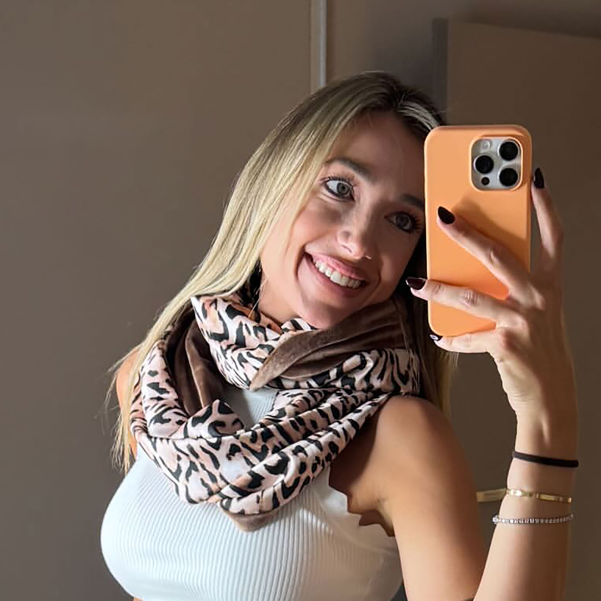 - Ρύθμισε το μήκος: η πάνω λούπα να αγκαλιάζει τον λαιμό, η κάτω να «σπάει» στο στήθος.