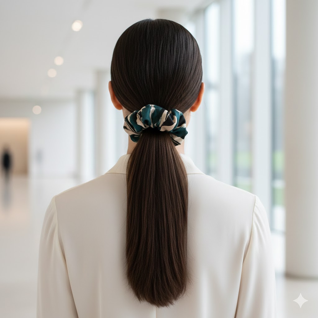 Φόρεσέ το σε ψηλή αλογοουρά για playful αποτέλεσμα ή σε χαλαρό κότσο για πιο elegant look. Ταιριάζει ιδανικά με γήινα outfits και αποχρώσεις teal.