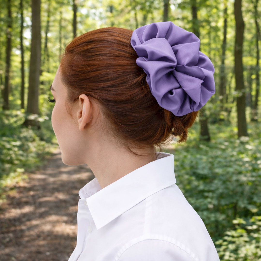 Φόρεσε το σατέν scrunchie-style κλάμερ σε καθαρό, χαμηλό πιάσιμο, αφήνοντας το ύφασμα να λειτουργήσει σαν διακριτικό κόσμημα στα μαλλιά. Συνδύασέ το με ασορτί. ή contrast πουκάμισο, φυσικό μακιγιάζ και καθαρές γραμμές, ώστε το χρώμα και η υφή του σατέν να αναδειχθούν χωρίς υπερβολή.